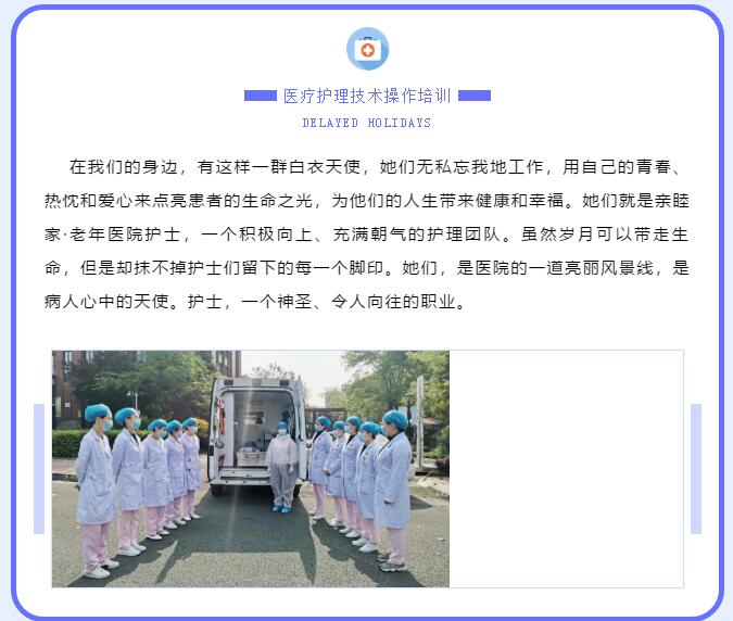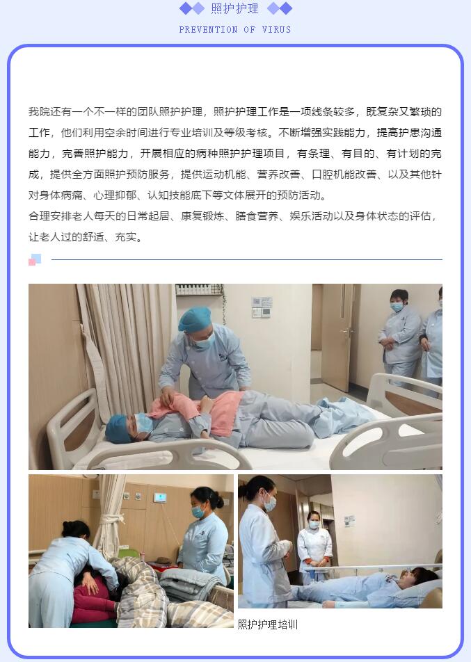 • 老年疾病患者往往伴随生活自理能力的下降,甚至丧失,我们引进“日式照护体系”,实现护理和照护一体化。照护团队全程、全天候24小时服务,确保每一位老人在院期间都能得到一对一的治疗和照护,以减轻社会和家庭的负担,解除老人亲属陪护的后顾之忧,用爱心、细心、耐心、孝心、真心为老人营造温馨家园!