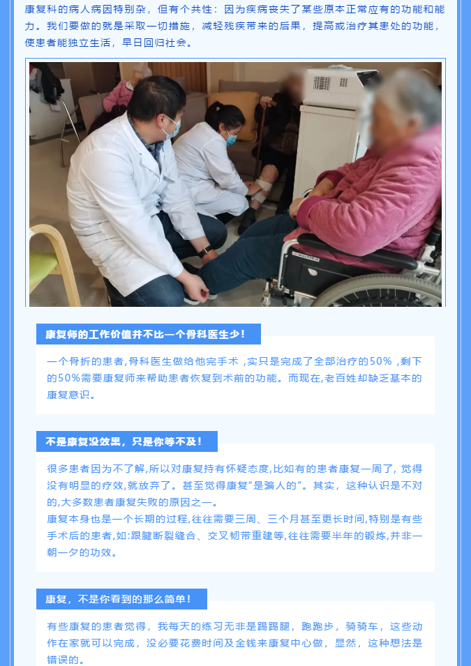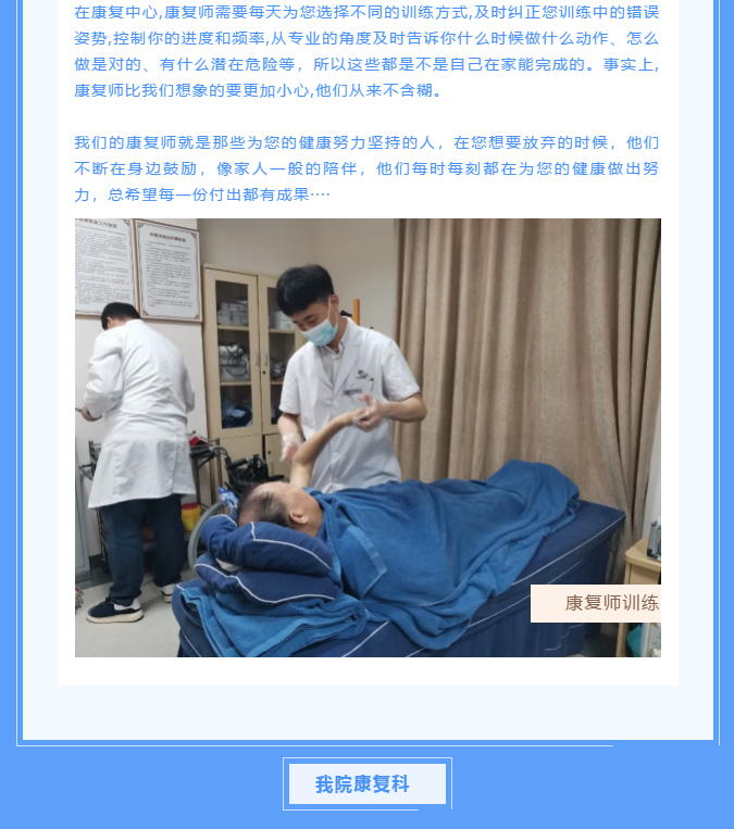 • 老年疾病患者往往伴随生活自理能力的下降,甚至丧失,我们引进“日式照护体系”,实现护理和照护一体化。照护团队全程、全天候24小时服务,确保每一位老人在院期间都能得到一对一的治疗和照护,以减轻社会和家庭的负担,解除老人亲属陪护的后顾之忧,用爱心、细心、耐心、孝心、真心为老人营造温馨家园!