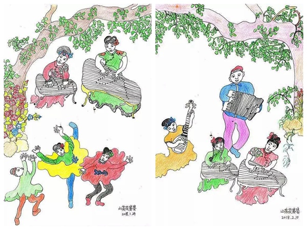 这两幅画是奶奶的学生所作。其实,也是一位70多岁的老奶奶。从作品中我们深深感受到奶奶年轻而有朝气的心态,那种乐观豁达的态度让人感叹。