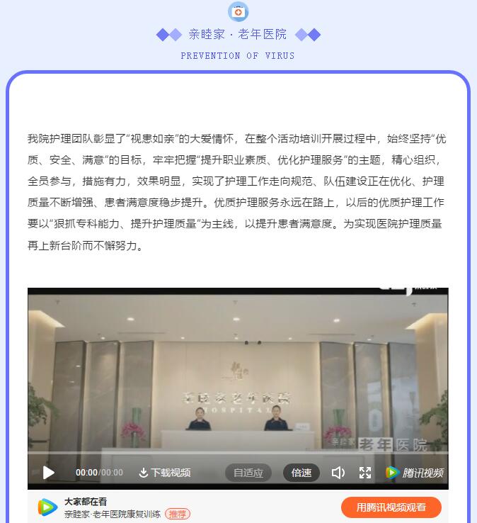 • 老年疾病患者往往伴随生活自理能力的下降,甚至丧失,我们引进“日式照护体系”,实现护理和照护一体化。照护团队全程、全天候24小时服务,确保每一位老人在院期间都能得到一对一的治疗和照护,以减轻社会和家庭的负担,解除老人亲属陪护的后顾之忧,用爱心、细心、耐心、孝心、真心为老人营造温馨家园!